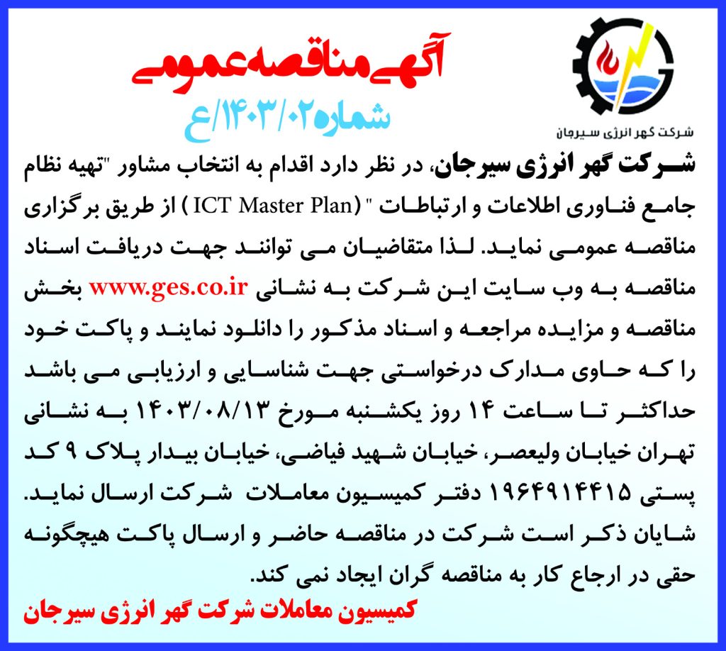 آگهی مناقصه عمومی (تهیه نظام جامع فناوری اطلاعات و ارتباطات)شماره 02/1403/ع
