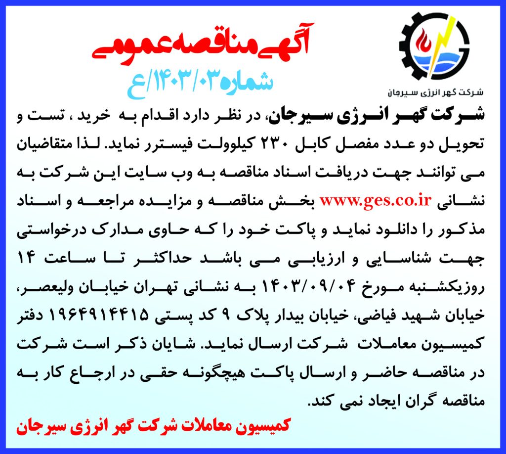 مناقصه عمومی شماره ۰۳/۱۴۰۳/ع (دو عدد مفصل کابل ۲۳۰ کیلوولت)