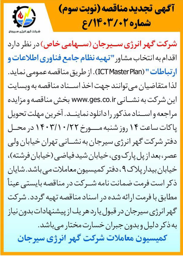 آگهی تجدید مناقصه (نوبت سوم) _ تهیه نظام جامع فناوری اطلاعات و ارتباطات _ شماره 02/1403/ع