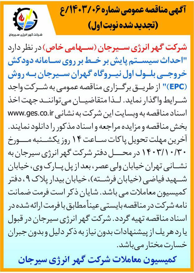 آگهی مناقصه عمومی شماره 06/1403/ع – تجدید شده نوبت اول (سیستم پایش بر خط بر روی سامانه دودکش)