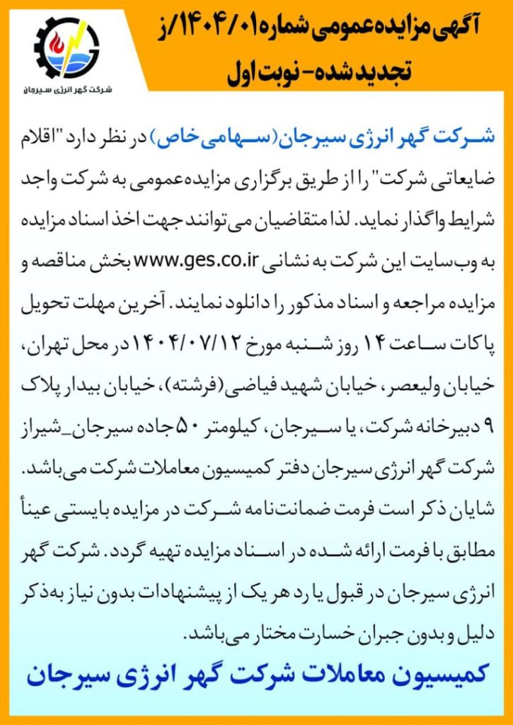 مزایده عمومی شماره ز/1404/01 اقلام ضایعاتی شرکت (تجدید شده-نوبت اول)