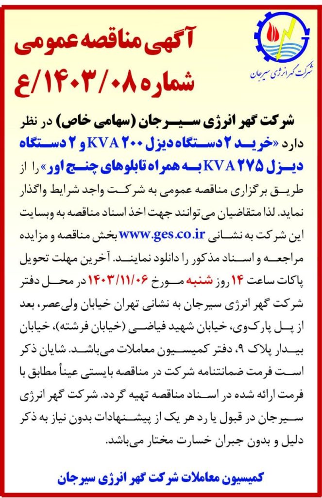 مناقصه عمومی شماره ع/1403/8(خرید 2دستگاه دیزل KVA 200و 2دستگاه دیزل KVA 275)